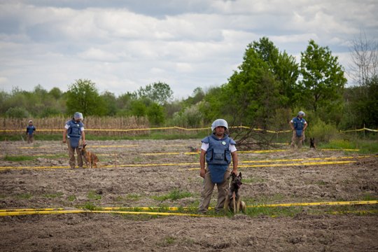 In Skipovac Donji, bei Glückspilz Todor Jankovic, hat die norwegische NGO Norwegian People’s Aid (NPA) im April dieses Jahres mit den Räumarbeiten begonnen. Knapp 103.000 Quadratmeter müssen Stück für Stück gesäubert werden. In flachen Bereichen kommt ein gepanzertes Fahrzeug zum Einsatz. „Damit können wir viele Minen auslösen und unschädlich machen“, erläutert Amela Balic, Operation Manager von NPA. „Danach müssen zuerst die Spürhunde, dann unsere Entminer ran“. Die perfekt gedrillten Hunde suchen entlang einer geraden Schnur in der Erde nach Explosivstoffen. „Erst wenn zwei Spürhunde das Gebiet untersucht und nichts entdeckt haben, kommen die Entminer dran“, erläutert Balic das strenge Sicherheitsprotokoll.