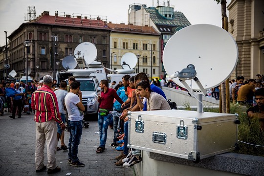 Hinzu kommt das rasante Tempo, in dem sich die Schauplätze der Flüchtlingskrise verlagern. Am vorvergangenen Sonntag war ich noch an der serbisch-ungarischen Grenze und sammelte Eindrücke an dem Zaun, der gerade fertiggestellt worden war. Den kompletten Montag saß ich im Hotel, produzierte Beiträge und gab Interviews. Am Dienstagmorgen ging es dann im Eiltempo nach Budapest. Ich baute im Bahnhofsrestaurant provisorisch meine Technik auf und machte weiter mit Beiträgen und Live-Gesprächen.