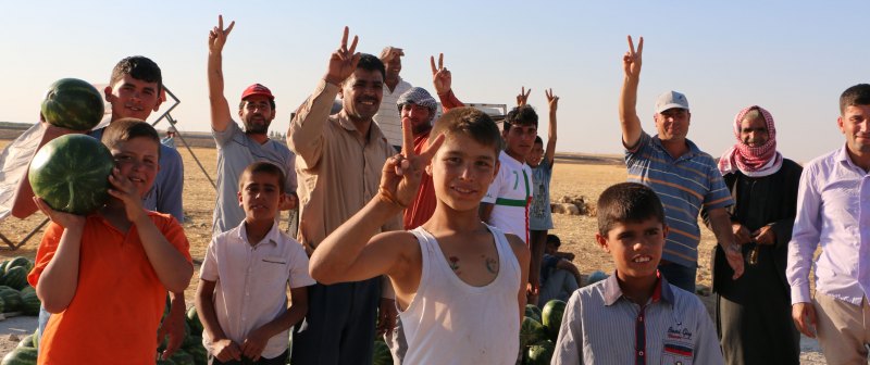 Melonenkäufer und Verkäufer vor dem AFAD Flüchtlingscamp bei Suruc. In der Türkei leben derzeit etwa 1,8 Millionen Flüchtlinge aus Syrien. Es entstehen immer mehr neue Flüchtlingslager entlang der Grenze./ Foto: Claws Tohsche