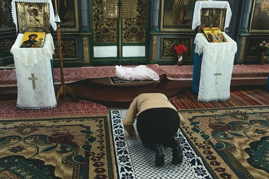 Für das weihevolle Erlebnis der Mysterienfeier und die Feierlichkeit der orthodoxen Liturgie ist heute fast keine Zeit. Zwei Kinder werden heute Nachmittag getauft, die Taufzeremonie ist ein komplexes Ritual. Bevor der Priester die Taufpaten mit den Kindern die Kirche betreten lässt, legt er den Säuglingen die Hand auf als Zeichen des Segens. Danach folgt das Gebet, das die unreinen Geister vertreiben soll. Stellvertretend für die schutzlosen Säuglinge stellen sich die Taufpaten gegen die finsteren Mächte, blicken in ihre Richtung, nach Westen, und unterstreichen die Herausforderung und mit einem verächtlichen Ausspucken.
