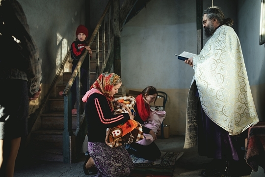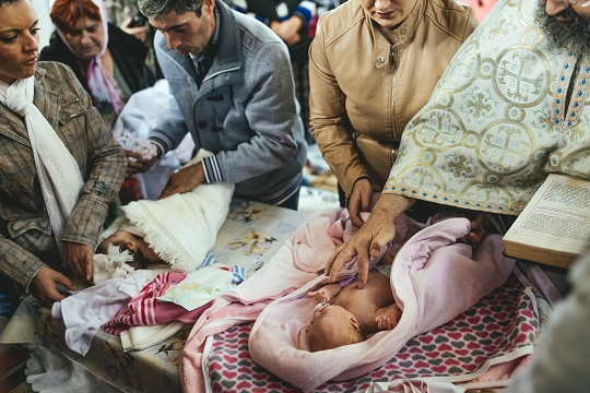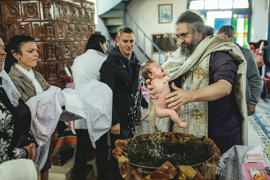 Nacheinander übergeben die Taufpaten die Babys dem Priester, der ihnen die Hand über das Gesicht drückt und sie schnell dreimal hintereinander in das Taufbecken taucht. Die Paten empfangen die Kinder zurück und hüllen sie in ein blendend weißes Leintuch. Catalin, der seine Nervosität vorher mit Scherzen überspielt hat, kann ein paar Tränen nicht verdrücken. Der Priester und die Taufpaten fassen sich an der Hand und umschreiben den Altar und das Taufbecken, während die alten Frauen, die der Feier beiwohnen die Kinder wieder einpacken.