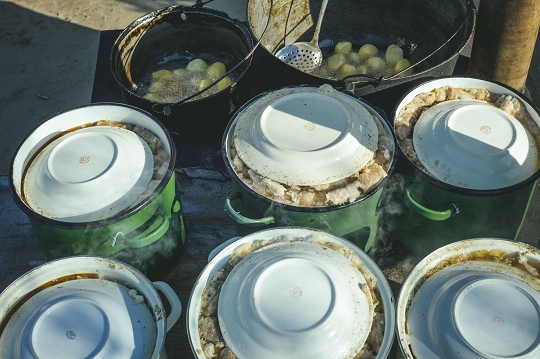 Im Hof der Eltern des Patenkindes von Catalin ist ein Zelt aufgebaut: rohe Holzpfosten, Plastikplane und alle verfügbaren Teppiche und Wolldecken an den Wänden um den inzwischen kalten und stürmischen Wind abzuhalten. Schon von weitem ist der Manele-Turbo-Folk zu hören. Laurentiu, der Keyboarder, ist in Ekstase. Ziemlich betrunken lässt er die Tasten fliegen und macht Ansagen an ein imaginäres Publikum. Im Hof werden kleine Kartoffeln in abgesägten Eisentonnen frittiert, Würste aus Schweinehack abgedreht, in sechs großen Kochtöpfen garen Sarmale, mit Hackfleisch gefüllte Krautwickel. Alle sind hungrig, aber niemand weiß, wann es losgehen soll. Es interessiert auch keinen.