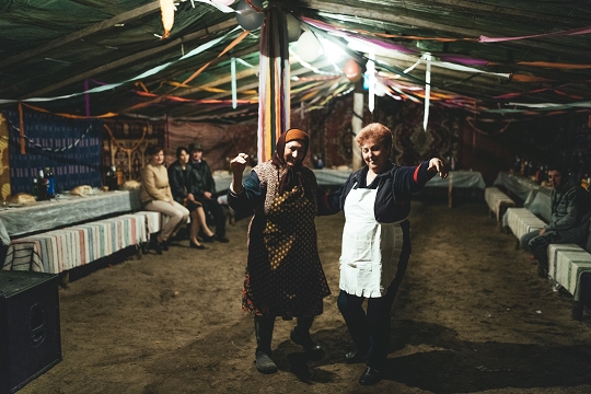 Zwischen den Gängen wird getanzt, immer wieder neue Flaschen gebracht, trüber weißer Wein und natürlich Țuică, scharfer Schnaps aus den Traubenrückständen. Am Kopfende des Zeltes sitzen die Eltern, die Taufpaten und die Großeltern. Einer der Paten, meistens Catalin, versorgt die neuankommenden Gäste sofort mit einem Glas Kirschlikör. Die Feier dauert bis in die frühen Morgenstunden. In der absoluten Dunkelheit Lethes scheint das Zelt aus der Ferne wie ein leuchtendes Raumschiff, ein warmer Ort in einer kalten Nacht und eine verschworene Gemeinschaft, die eine ganze Nacht lang trinkt, tanzt und das Leben feiert.