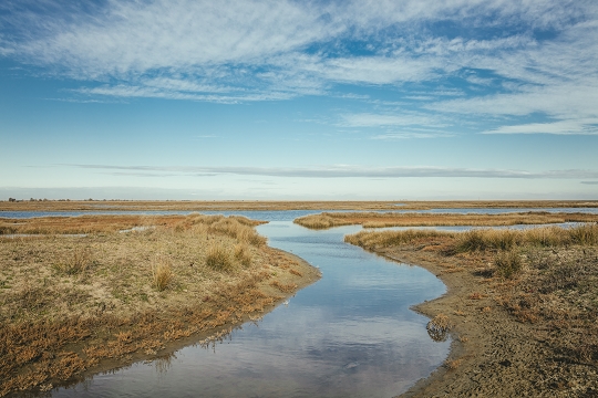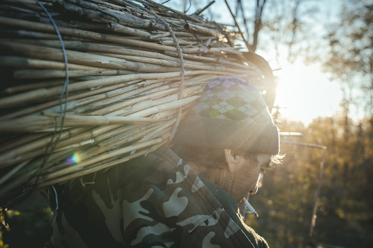 Am Nachmittag frage jeden der Fischer, die ich in den letzten Tagen besucht habe, nach Reetschneidern. Susana kann mir weiterhelfen: Costa hat ihm erzählt, dass er selbst Schilf braucht, um seine Hütte auf dem Grundstück winterfest zu machen. Wir finden Costa mit Gummistiefeln in der Nähe seines Hauses an einem Schilffeld im Schlamm stehen. Das Wasser ging ihm während der Arbeit schon bis zu den Knien, seine Stiefel sind vollgelaufen. Er ist gerade fertig geworden, im Sonnenuntergang macht er sich mit dem geschulterten Bündel auf den Heimweg.