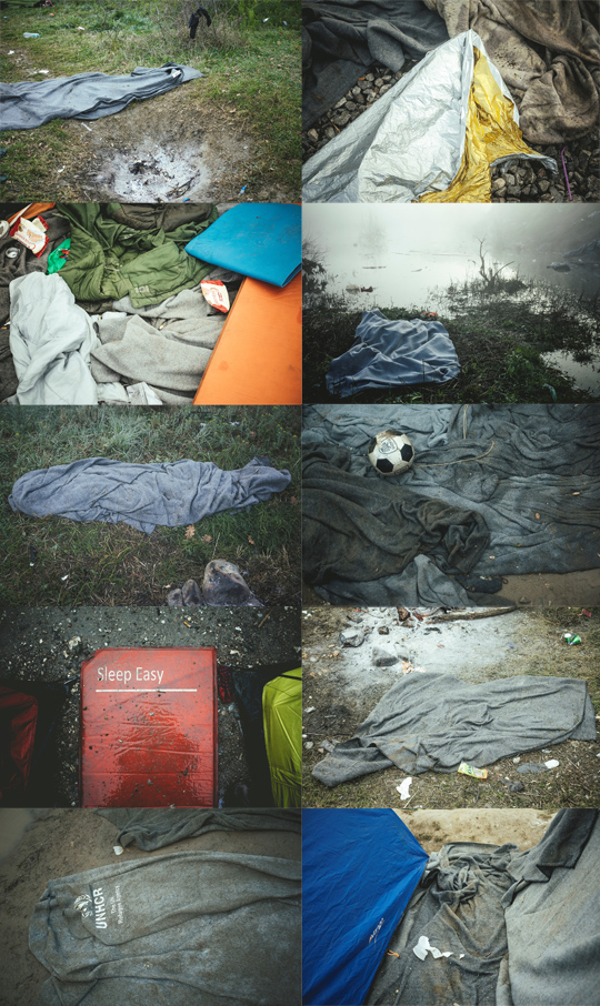 „Zelte gibt es in Idomeni längst nicht für alle. Vielen bleiben nur die grauen Decken, die das UN-Flüchtlingshilfswerk austeilt. Ich fotografierte die Nachtlager kurz nachdem die Menschen aufgestanden sind – und bevor sie die regennassen Decken zum Trocknen über die Bäume gehängt haben.