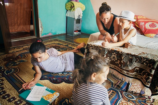 Hier gibt eine Freiwillige aus Deutschland Nachilfe bei einer Familie zu Hause. Inzwischen will ein Roma-Mädchen aus dem Ort Ärztin werden. Das war vor Jahren noch undenkbar.