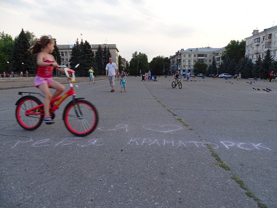 "Ich liebe dich Kramatorsk",nachdem die Stadt drei Monate unter pro-russischer Kontrolle war, wurde sie im Sommer 2014 von der ukrainischen Armee zurück erobert. / Foto: Sabine Brunner, n-ost