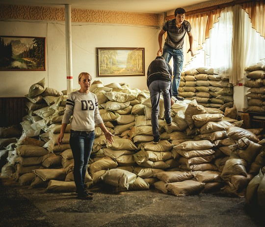 Die Hälfte der knapp 10.000 Einwohner hat die Stadt verlassen. Geblieben ist, wer hier ein Haus, eine Wohnung oder als einer der wenigen eine Arbeit hat, statt mit leeren Händen ins Ungewisse zu fliehen. Alle Fabriken in Marinka sind geschlossen oder völlig zerstört. Viele der Bewohner sind auf humanitäre Hilfe angewiesen. Die angrenzende Metropole Donezk, früher die Lebensader der Region, heute Separatistenhauptstadt, ist ferner denn je. An den Checkpoints reihen sich täglich hunderte Autos ein, manchmal wartet man tagelang auf die Überfahrt.