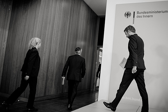 Thomas De Maizière offering an official press statement about refugees. This picture is from the project "Rebordering Europe" by Kaveh Rostamkhani. The full project can be seen here.