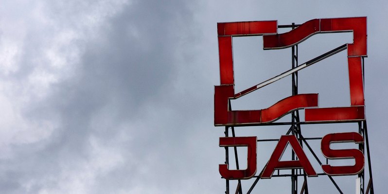 Das Logo von JAS, zwei aufeinander gestapelte Schuhe / Martin Fejer, n-ost, EST&OST