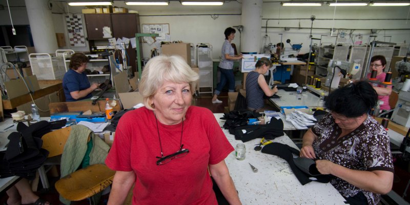 Kristina Goc-Benkova arbeitet an einem Holztisch im fünften Stock des schmucklosen Produktionsgebäudes, unter Neonröhren und umgeben von fünf Kolleginnen. Als sie an diesem Tag anfängt zuarbeiten, greift sie zuerst zu einem Damenstiefeloberteil und entfernt mit Lösungsmittel Kleberreste vom Inneren des Lederteils. Nach zwei Minuten folgt der nächste Stiefel. So geht es acht Stunden am Tag, unterbrochen von der halbstündigen Mittagspause, jeden Tag von montags bis freitags.