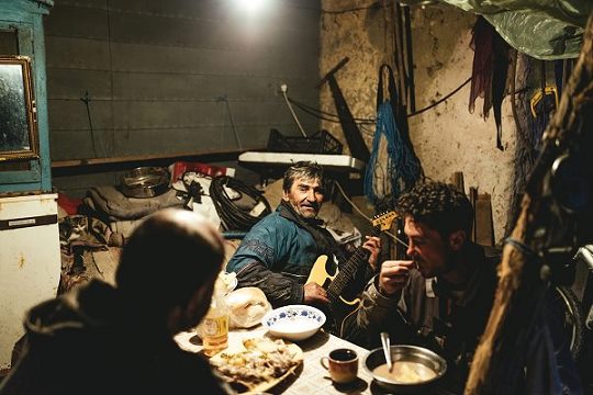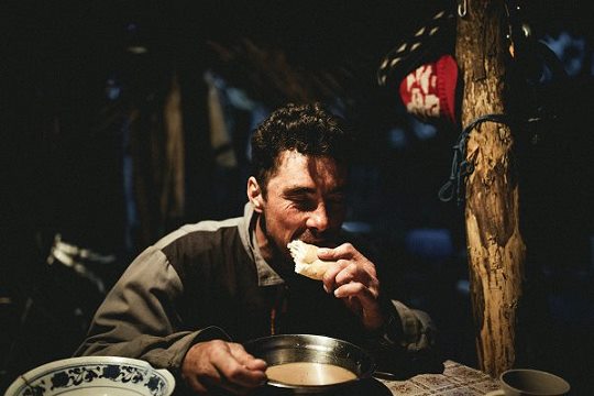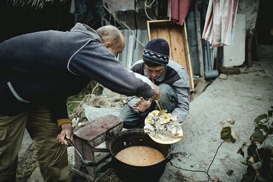 Am Abend esse ich bei den Fischern Mihai, Costa und dem Ukrainer Sergej. November und Dezember sind gute Monate für die Fischerei, der Fang ist besser als in den ersten Monaten nach der Schonzeit im Frühsommer. Jeden Tag, nachdem am Nachmittag die Arbeit beendet ist, bereiten die drei gemeinsam eine Fischsuppe zu. Die Laune ist hervorragend. Gegessen wird in zwei Gängen: Zuerst der Fisch, mit den Händen zerteilt, es gibt Zander, große Stücke vom Wels, Brachsen und grätige Karauschen Dann die eigentliche Suppe, aromatisch, salzig, kräftig. Jeder Bissen Brot saugt sich voll. Von der fein gestoßenen Knoblauchpaste bleibt nichts übrig.