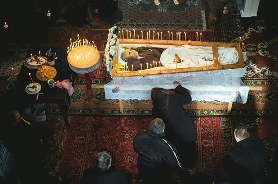 Heute war ich auf der Beerdigung eines lipowenischen Fischers in der St. Nikolaus-Kirche der Altgläubigen-Gemeinde von Sulina. Von der Empore der baufälligen Kirche aus konnte ich die Liturgie beobachten. Der Ruß der Kerzen hat die Fresken in den Kuppeln mit einem schwarzen Film überzogen, die Ikonen leuchten warm und dunkel. Die Trauernden ziehen an dem aufgebahrten Toten vorbei und küssen ihm die Stirn. Die Witwe kniet regungslos mit dem Gesicht am Boden neben der Bahre.