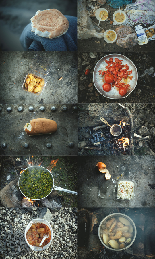 „Eine Familie aus Afghanistan hat Wildkräuter gesammelt und kocht sie über dem Feuer. Eine andere konnte mit Glück im Dorfladen von Idomeni ein paar Tomaten erstehen. Zwei junge Männer aus Syrien kochen sich einen Kaffee.