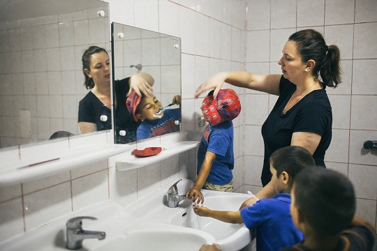 Die Direktorin des Tageszentrums, Natalia Bianca Ursachi, mit ihren kleinen Gästen.